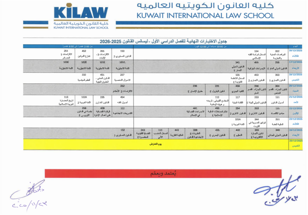 25 Nov Events & Announcements جدول الاختبارات النهائية للفصل الدراسي الأول – ليسانس القانون ٢٠٢٥-٢٠٢٦ Posted on November 25, 2025November 25, 2025 by Webmaster