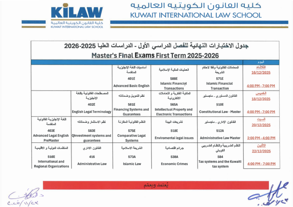 25 Nov Events & Announcements جدول الاختبارات النهائية للفصل الدراسي الأول – الدراسات العليا ٢٠٢٥-٢٠٢٦ Posted on November 25, 2025November 25, 2025 by Webmaster